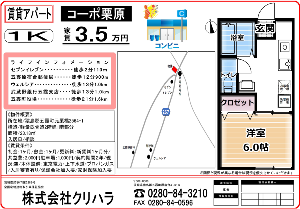 【賃貸アパート】元栗橋 1Kup 3.5万円 1K 物件の詳細を見る 賃料 3.5万円 アパート 間取1K 共益費・管理費2,000円 敷金1ヶ月 礼金1ヶ月 更新料1ヶ月 所在地 茨城県猿島郡五霞町 大字元栗橋2564-1 コーポ栗原 交通 東武日光線 幸手駅 徒歩54分 (4300m) 築年月 構造 軽量鉄骨 面積 駐車場 1,000円 空有 部屋番号102号室 現況 空家 物件番号 設備・条件 単身者限定 プロパンガス 公営水道 ●入居審査有 ●保証会社加入要 ●家財保険加入要
